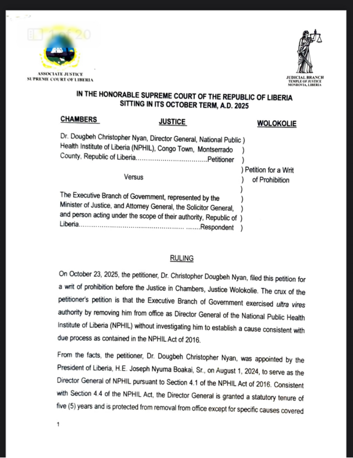 Monrovia – The Supreme Courtroom of Liberia has ordered the speedy reinstatement of Dr. Dougbeh Christopher Nyan as Director Normal of the Nationwide Public Well being Institute of Liberia (NPHIL), ruling that his removing by the Government Department was unconstitutional and violated statutory due-process protections.
