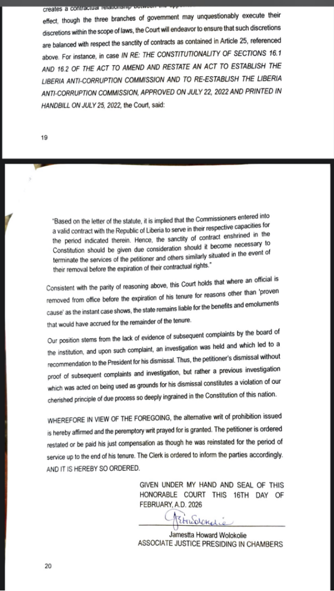 In a decisive ruling delivered Monday by Affiliate Justice in Chambers, Her Honor Jamestta Howard Wolokolie, the Courtroom held that Dr. Nyan’s dismissal lacked authorized and procedural foundation.