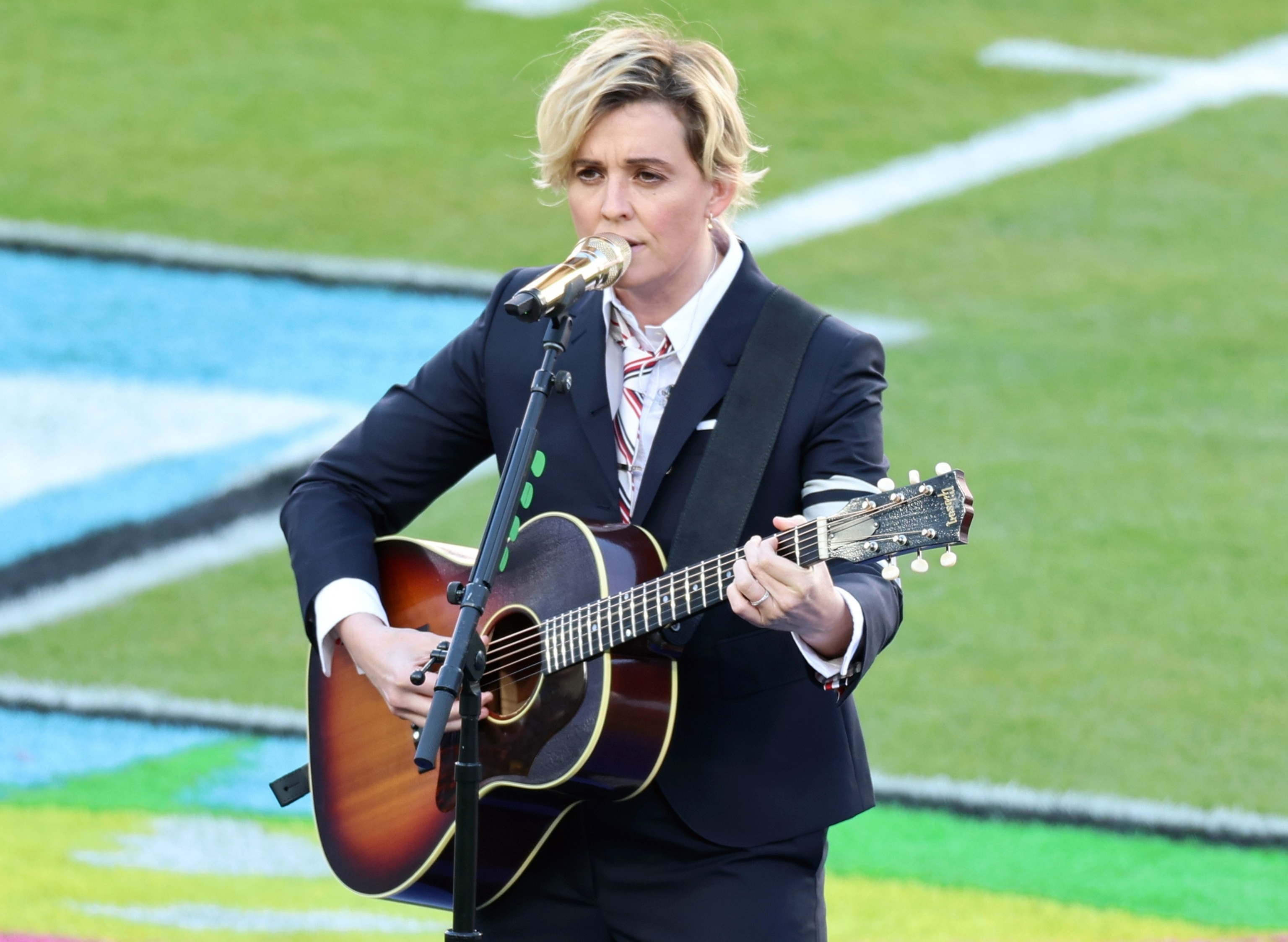 Brandi Carlile performs “America the Lovely” throughout Tremendous Bowl 60, February 8, 2026 in Santa Clara, Calif.