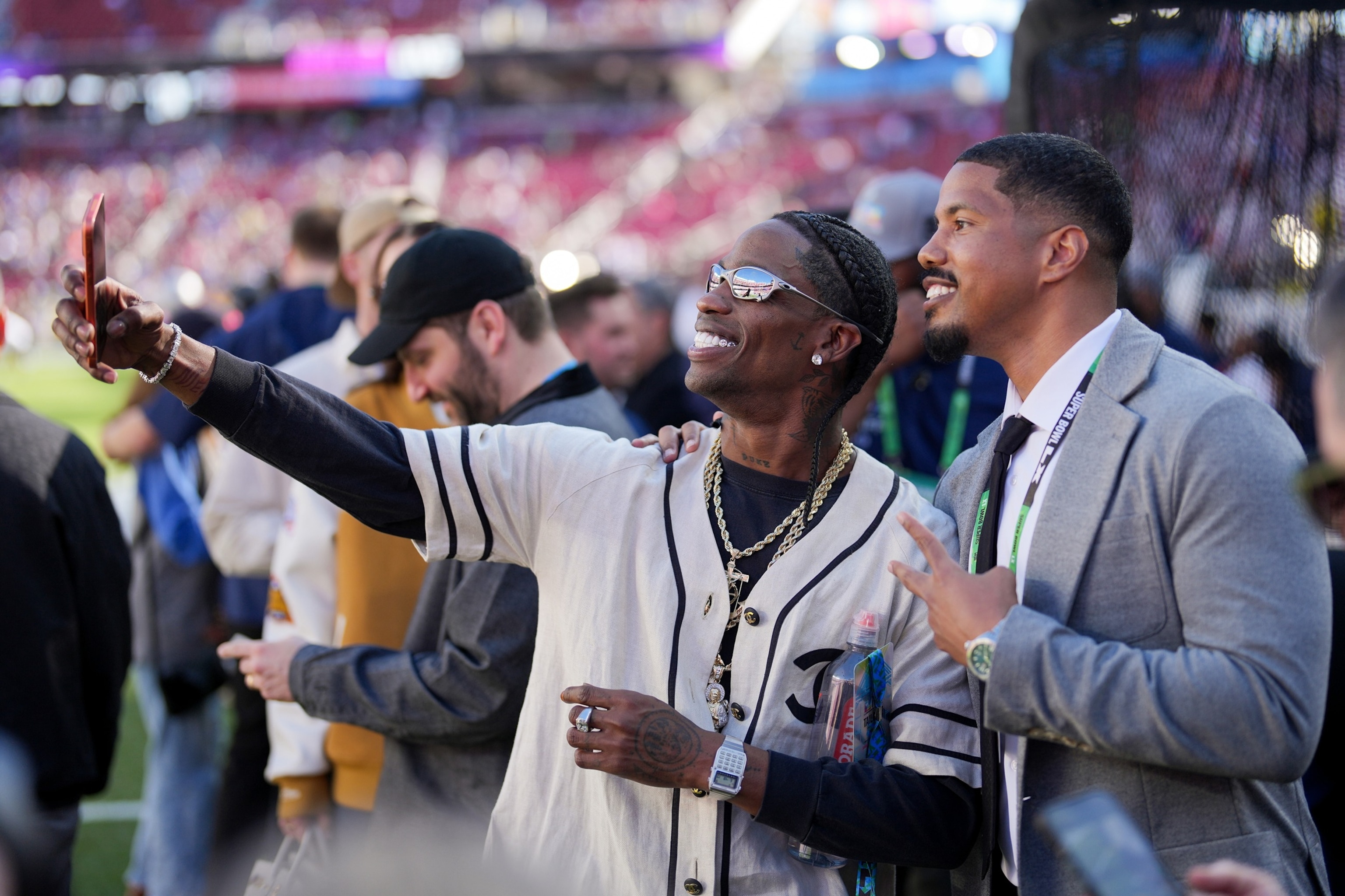 Travis Scott takes a selfiae with a New England Patriots worker earlier than the NFL Tremendous Bowl 60 soccer sport between the Patriots and the Seattle Seahawks, Feb. 8, 2026, in Santa Clara, Calif.