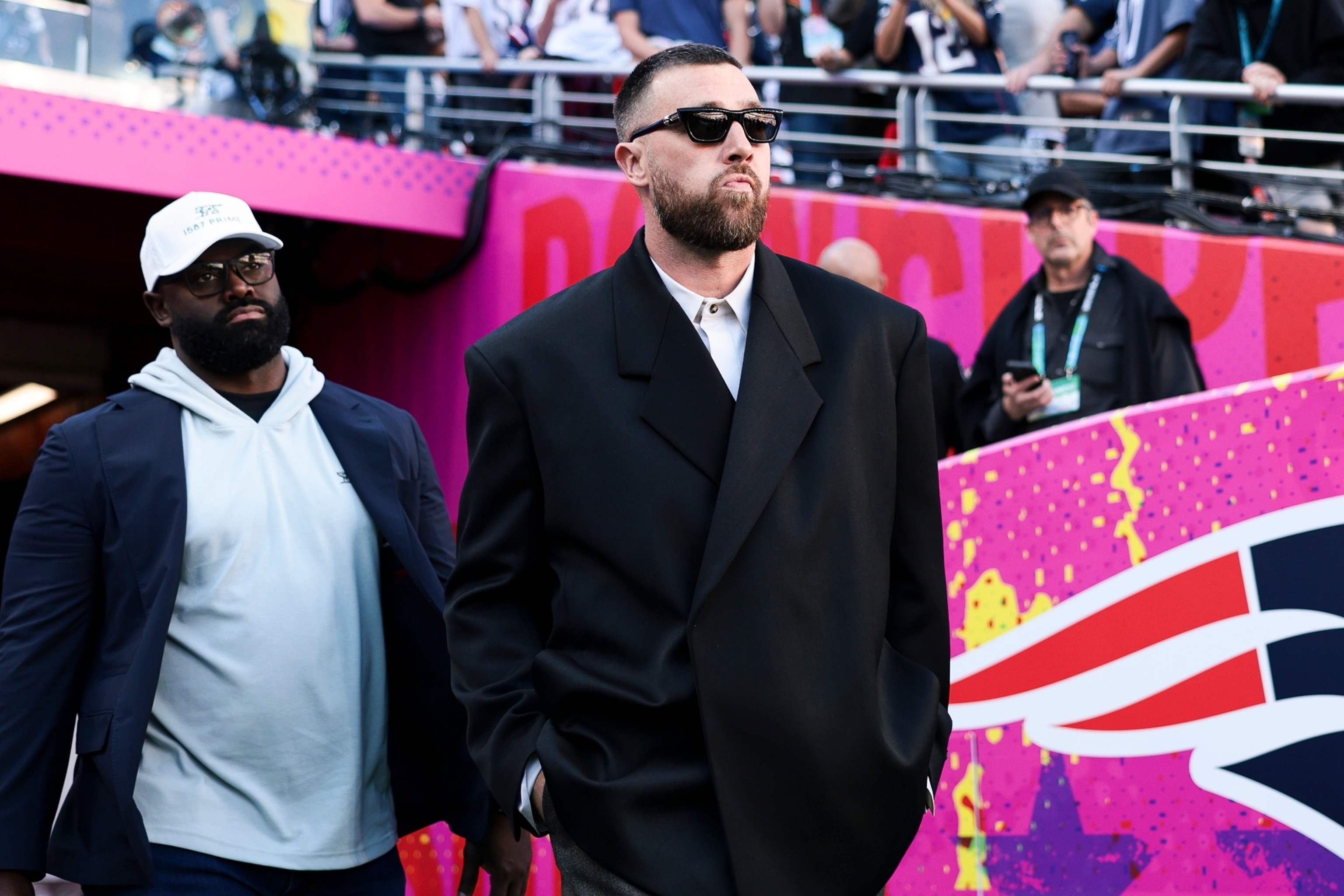 Travis Kelce of the Kansas Metropolis Chiefs walks on the sphere previous to Tremendous Bowl 60, February 8, 2026 in Santa Clara, Calif.